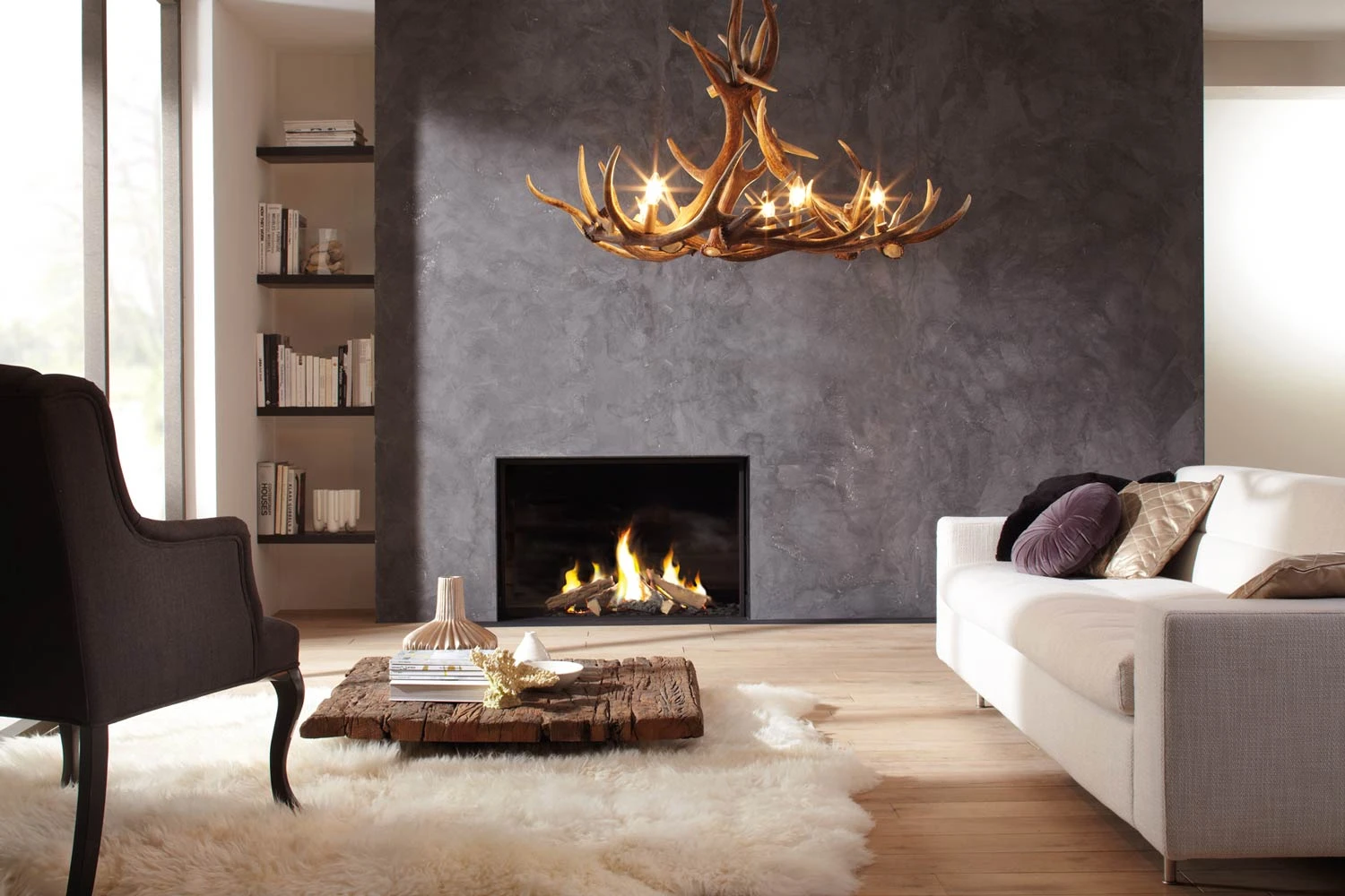 Entscheiden Sie sich bei der Wahl der Kamineinlage zwischen einem Holzimitat in Standard braun oder einer modernen Ausstrahlung mit Grey Cokes-Steinen. Die Rückseite der Feuerstätte kann optisch zwischen Schwarz glatt, Ceraglas schwarz oder Rib cast effect gewählt werden.
