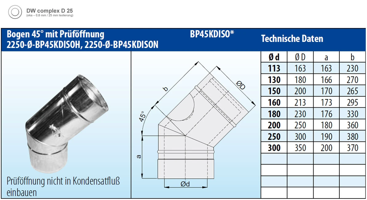 Doppelwandiger Edelstahlbogen in wählbaren Querschnitten 113 – 300 mm mit Prüföffnung aus hochwertigen V4A Edelstahl in der Materialstärke: 0,6 mm (1,0 mm auf Anfrage) in 25 mm Wärmedämmung (siehe oben) zur Schrägführung der Schornsteinanlage.
