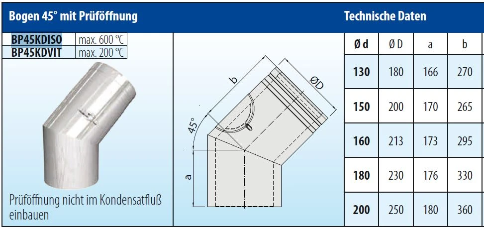Darüber hinaus lässt sich der doppelwandige Schornstein-Winkel der Reihe DW cosmos D 25 für Wärmeerzeuger einsetzen, deren Temperaturklasse 200°C bis zu 600°C beträgt und die für den Unter- und Überdruck geeignet sind. Die Muffentiefe von 80 mm und eine Materialstärke von 0,6 mm (auch erhältlich in 1,0 mm auf Anfrage) sorgen dafür, dass Sie lange etwas von Ihrem Produkt haben.