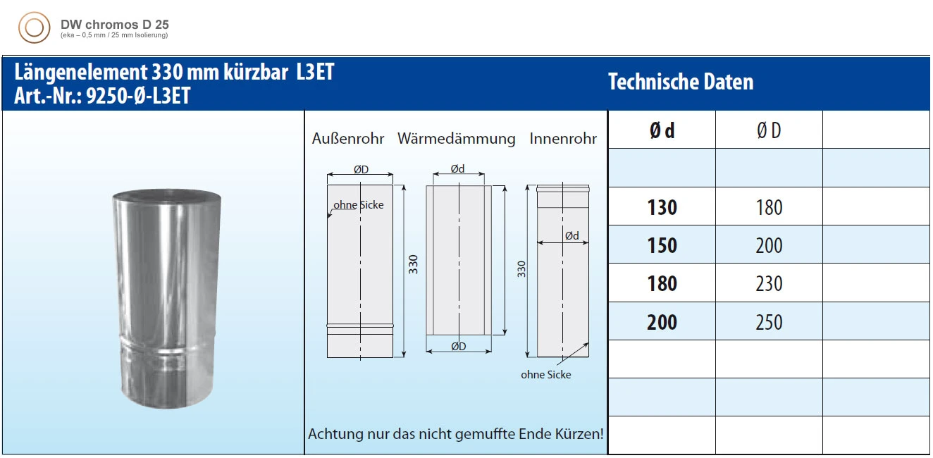 Schorsteinrohr Edelstahl 330 mm kürzbar / doppelwandig / eka chromos D 25